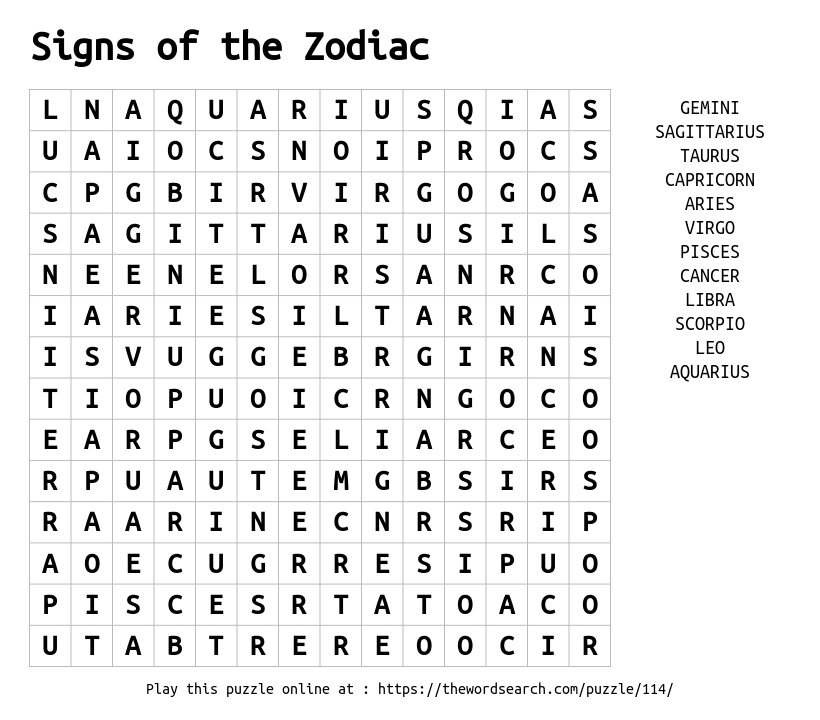 Signs of the Zodiac Printable Word Search