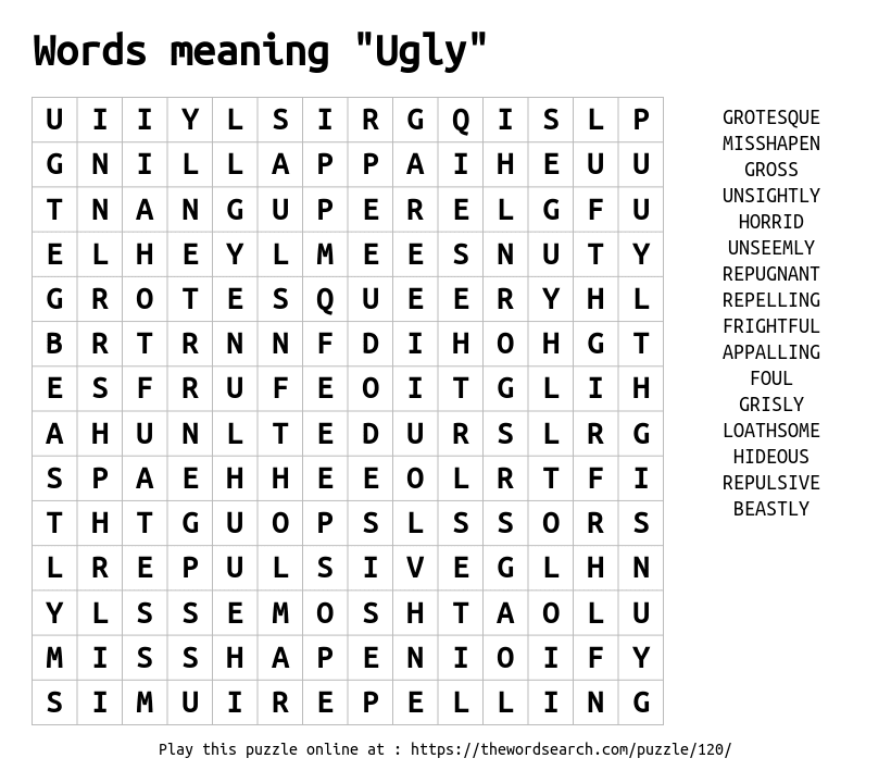 Find the synonyms for the word Ugly, and don't forget to also play our word search for the word Beautiful.