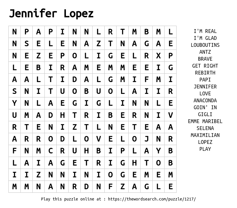 Formerly J.Lo, this word search covers the life and career of Jennifer Lopez