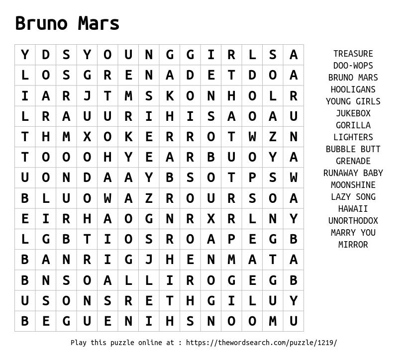 Word search based on the life and works of the great singer/songwriter Bruno Mars
