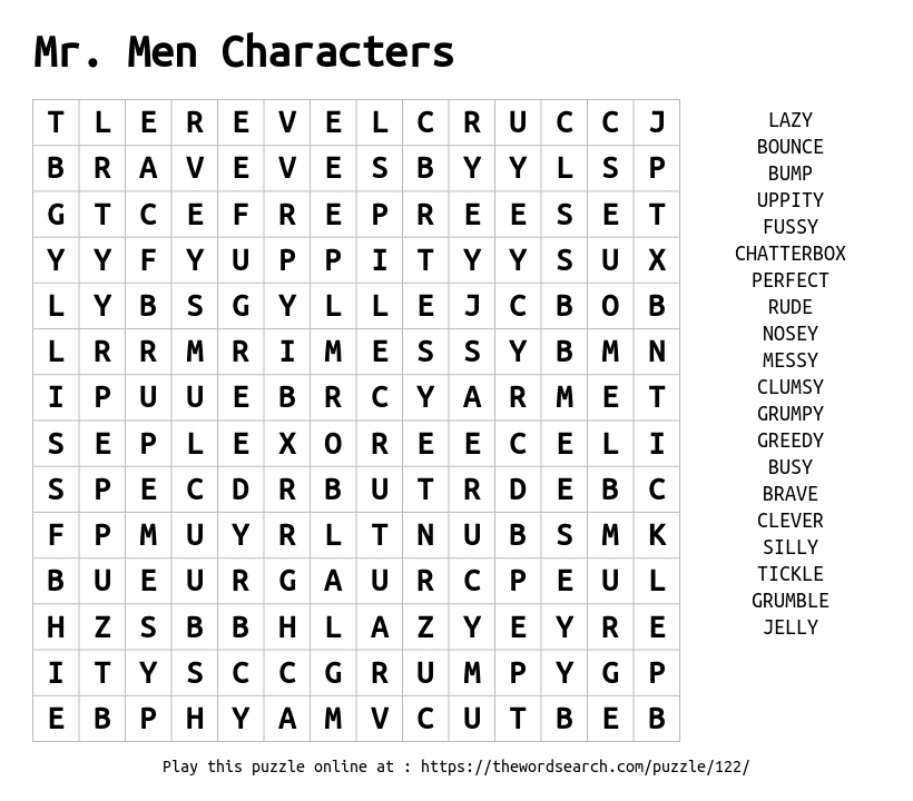 Mr. Men Characters Printable Word Search