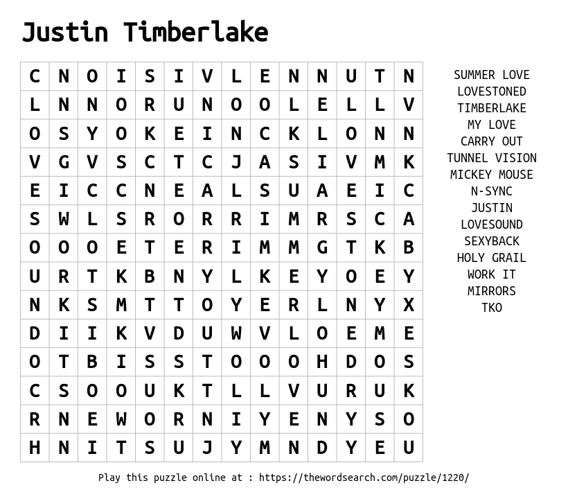 Justin Timberlake Printable Word Search