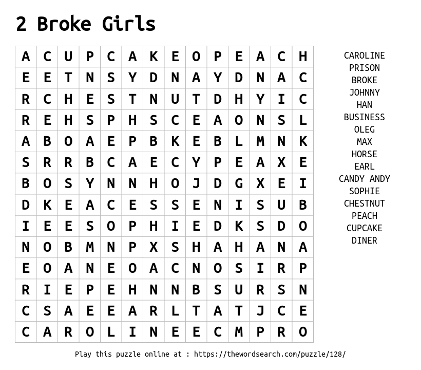 2 Broke Girls Printable Word Search