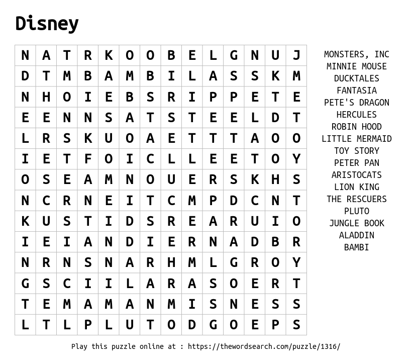 Word search based on popular Disney movies and characters