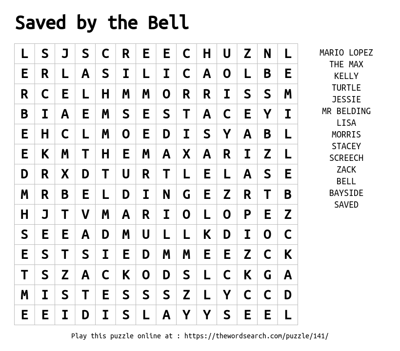 Home / Teen Television / Saved by the Bell / Printable Back to puzzle Saved by the Bell Printable Word Search If like me, you grew up watching Saved by the Bell and you're still a bit of a kid at heart then you'll enjoy this blast from the past in word search form.