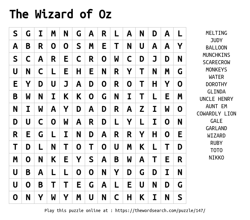 Words to Find (23) AUNTEM BALLOON COWARDLYLION DOROTHY EMERALDCITY GALE GARLAND GLINDA GOODWITCH JUDY MELTING MONKEYS MUNCHKINS NIKKO RUBY SCARECROW SLIPPERS TINMAN TOTO UNCLEHENRY WATER WICKEDWITCH WIZARD Puzzle ID: 147 | Generated by WordsPrintable.com