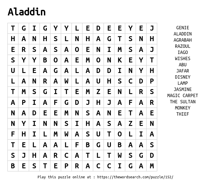 Aladdin Printable Word Search