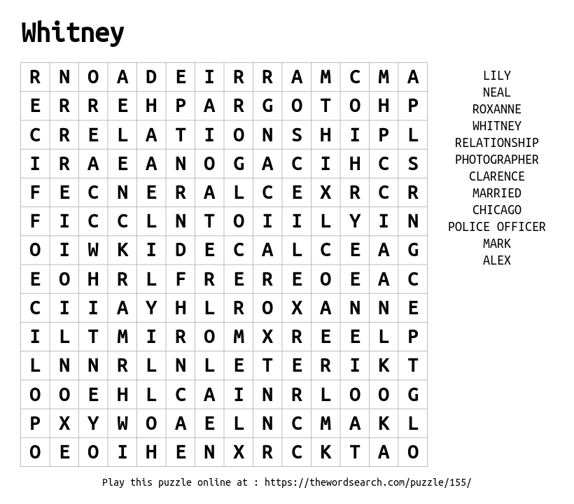 Words to Find (12) ALEX CHICAGO CLARENCE LILY MARK MARRIED NEAL PHOTOGRAPHER POLICEOFFICER RELATIONSHIP ROXANNE WHITNEY Puzzle ID: 155 | Generated by WordsPrintable.com