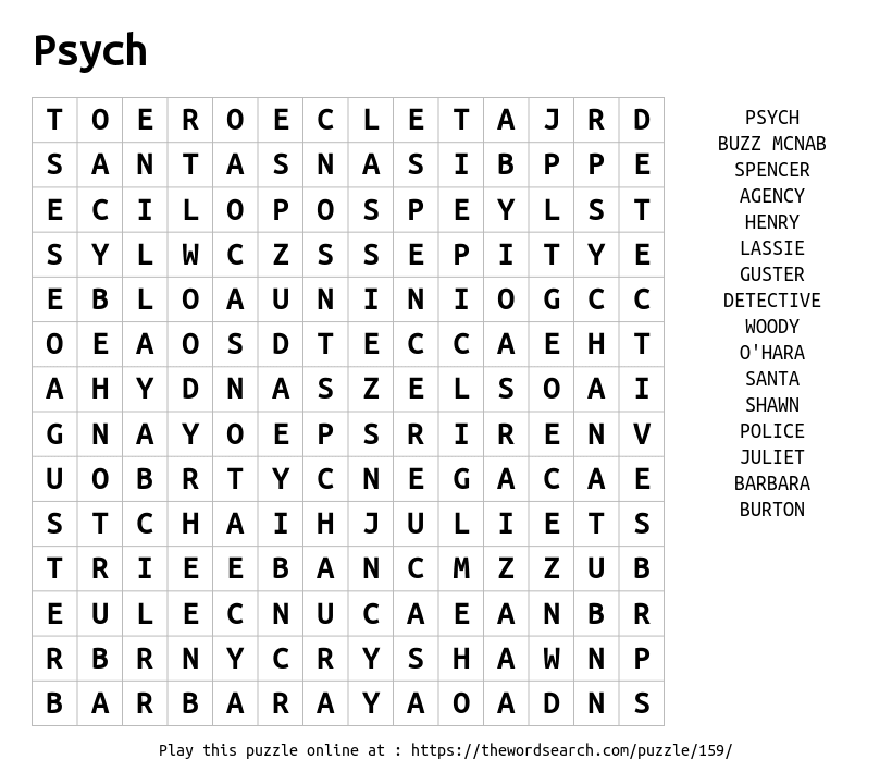 Psych Printable Word Search