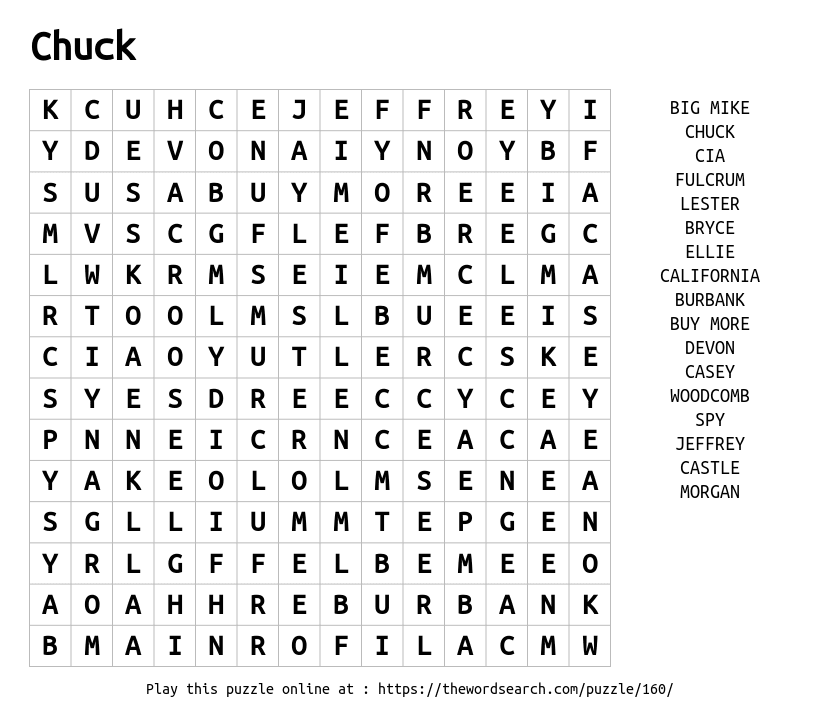 Word search puzzle on the tv show following the life of Chuck Bartowski, an accidental spy for the CIA.
