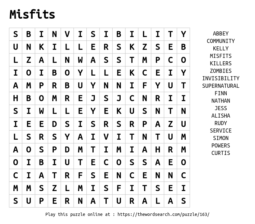 Words to Find (18) ABBEY ALISHA COMMUNITY CURTIS FINN INVISIBILITY JESS KELLY KILLERS MISFITS NATHAN POWERS RUDY SERVICE SIMON SUPERNATURAL TELEKINESIS ZOMBIES Puzzle ID: 163 | Generated by WordsPrintable.com