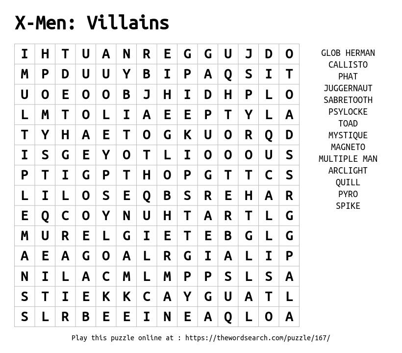 This word search covers the villains of the "Brotherhood of Mutants" from the X-Men movie franchise.
