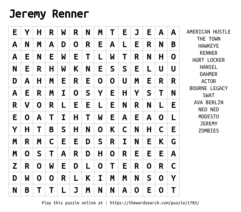Jeremy Renner Printable Word Search