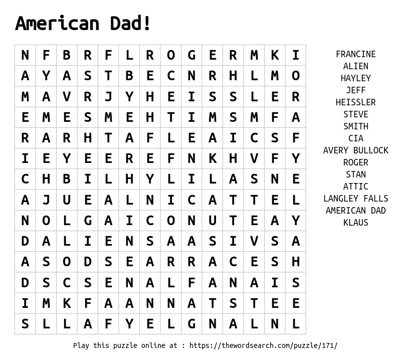 Another animated gem from Seth MacFarlane. This word search covers the main characters and recurring themes.
