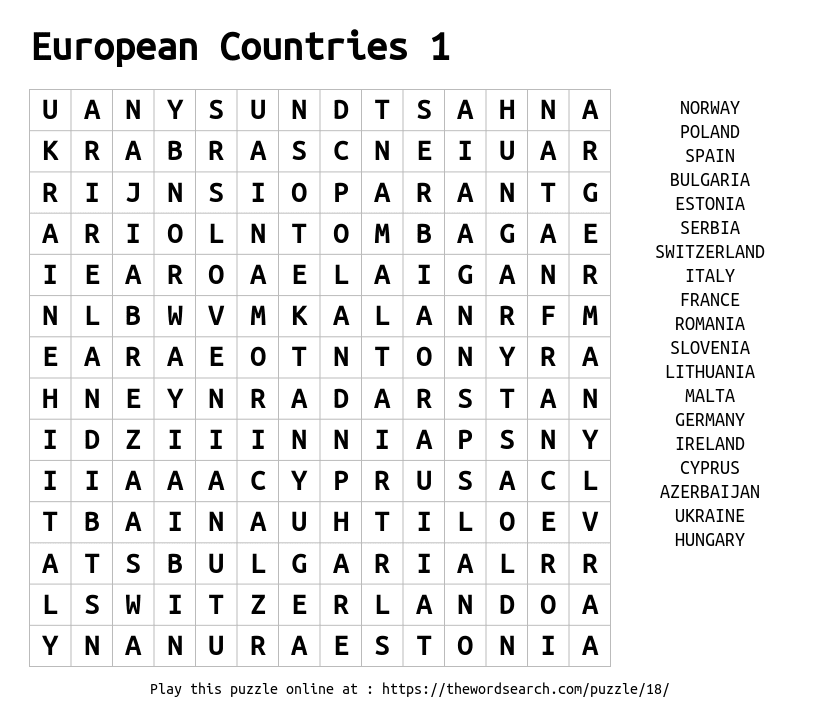Print this European Countries 1 word search and enjoy a relaxing puzzle with 20 words.