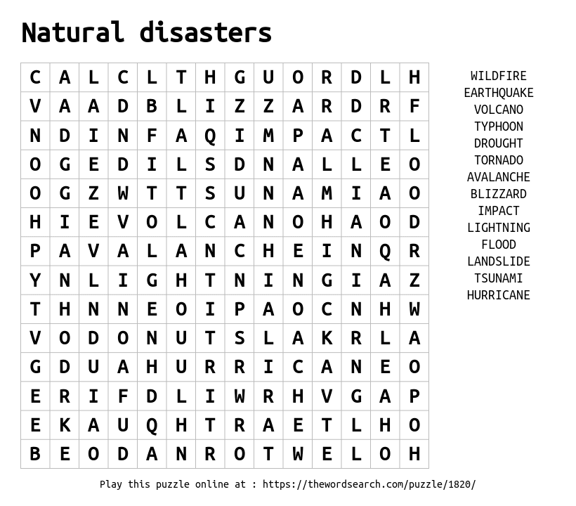 Word search game covering various forms of natural disasters