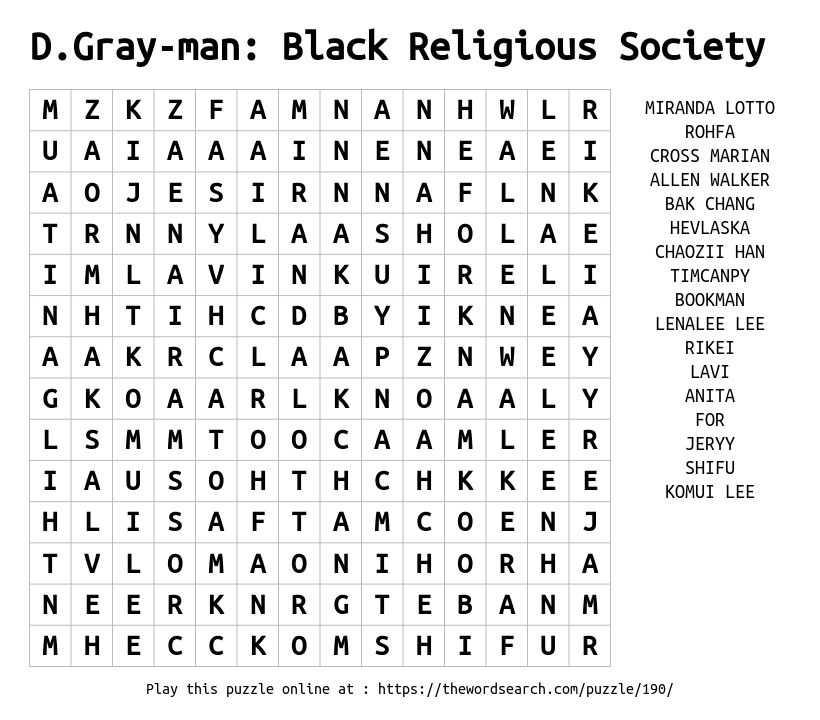 D.Gray-man: Black Religious Society Printable Word Search