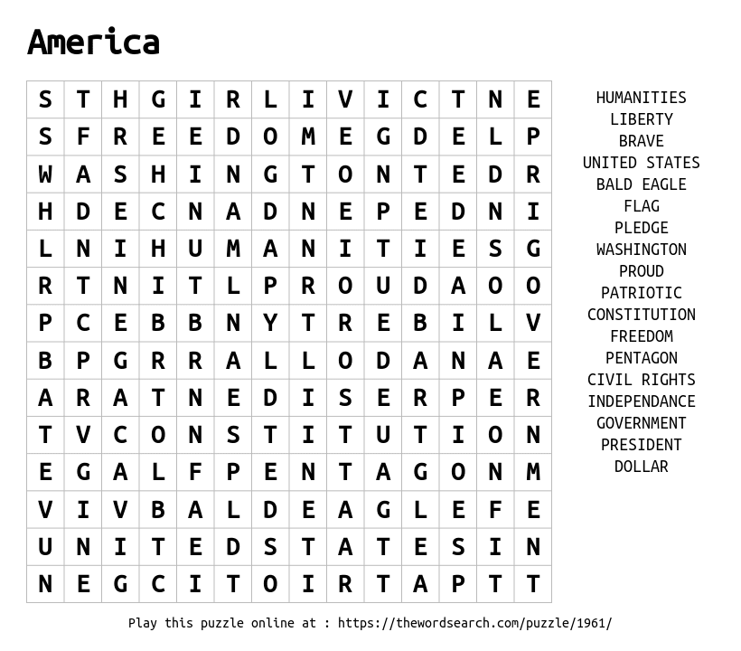 America Printable Word Search