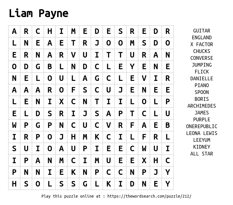 Liam Payne Printable Word Search