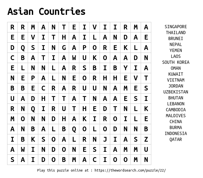 Print this Asian Countries word search and enjoy a relaxing puzzle with 23 words.