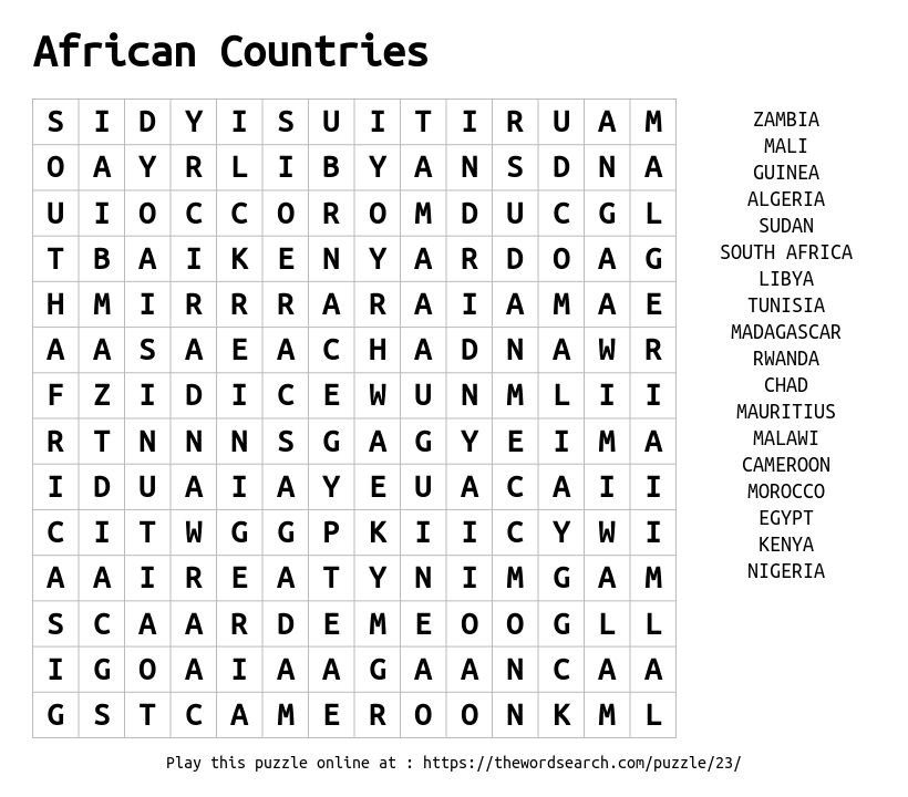 African Countries Printable Word Search