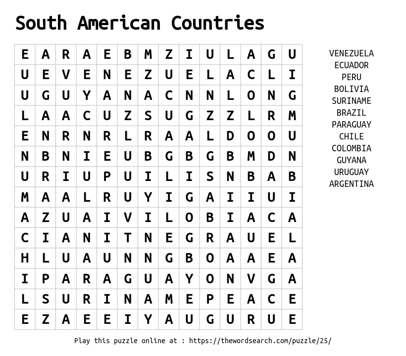 South American Countries Printable Word Search