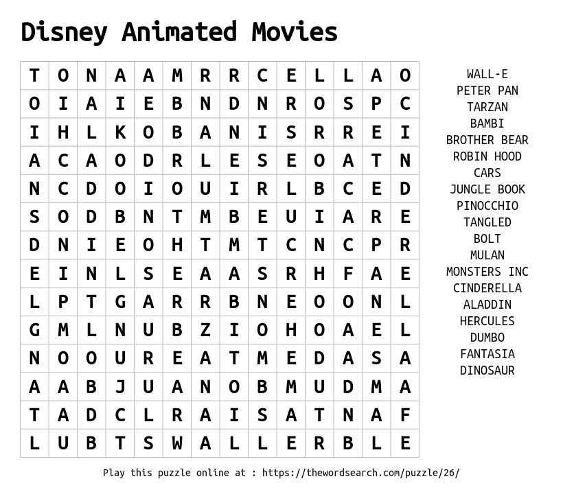 Disney Animated Movies Printable Word Search