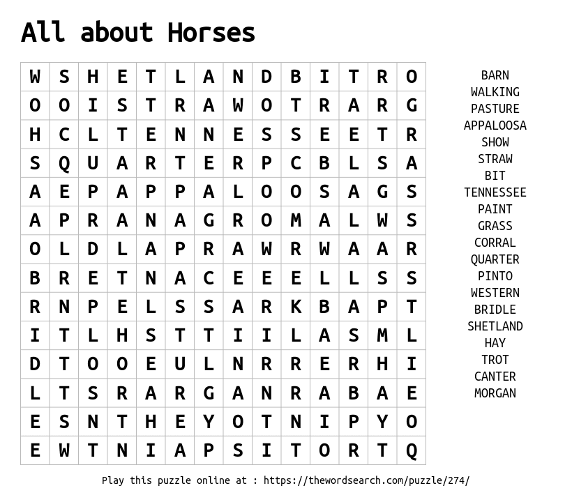 All about Horses Printable Word Search