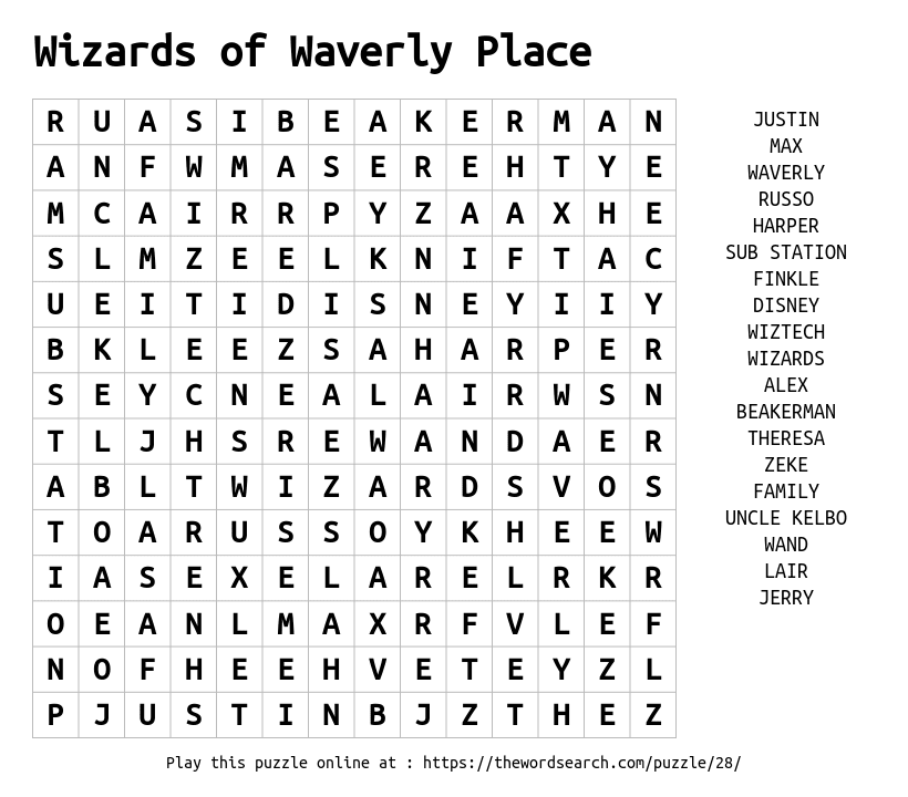 Wizards of Waverly Place Printable Word Search
