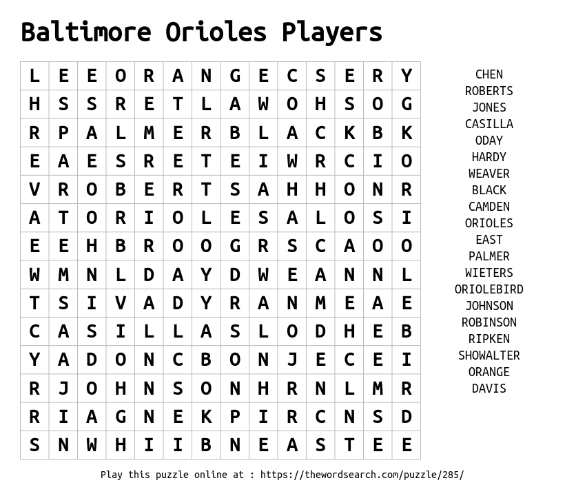 Baltimore Orioles Players Printable Word Search