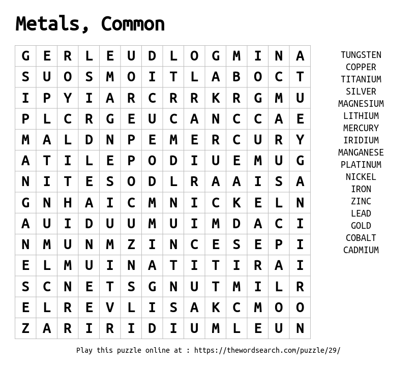 Print this Metals, Common word search and enjoy a relaxing puzzle with 17 words.