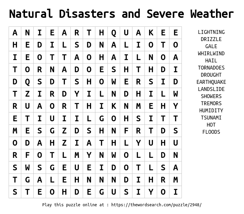 Natural Disasters and Severe Weather Printable Word Search