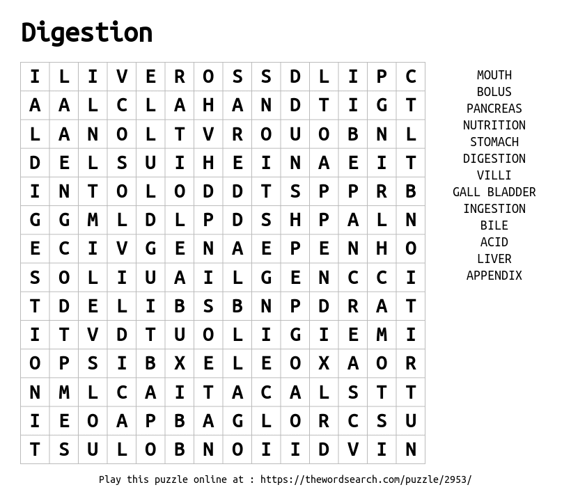 A word search on digestion, containing the keywords taught in schools.