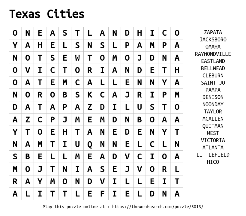 Texas Cities Printable Word Search