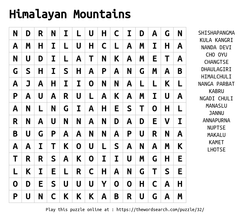Himalayan Mountains Printable Word Search