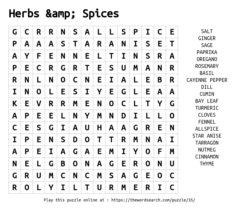 Print this Herbs & Spices word search and enjoy a relaxing puzzle with 20 words.