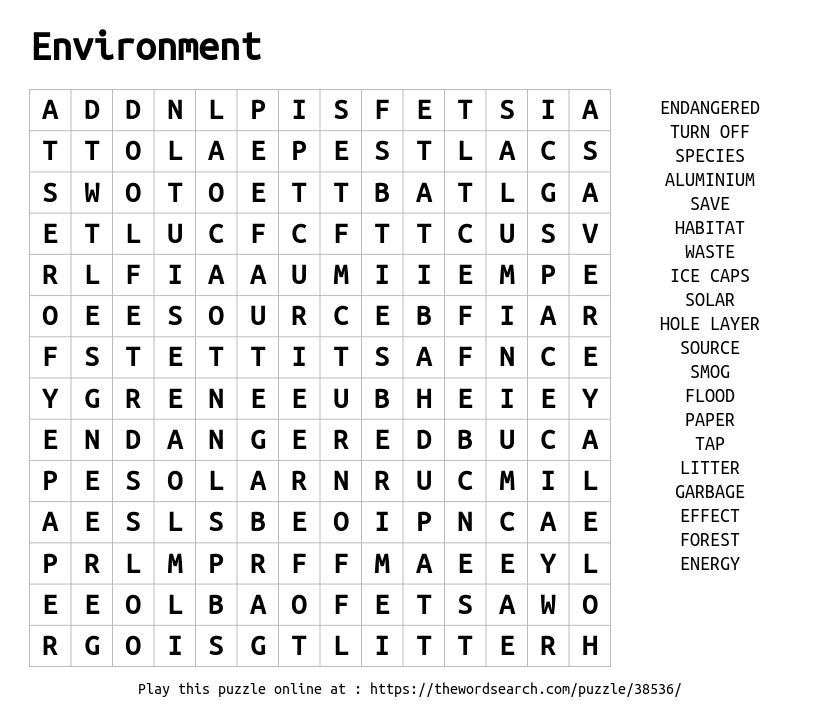 A word search game covering the topic of Environment
