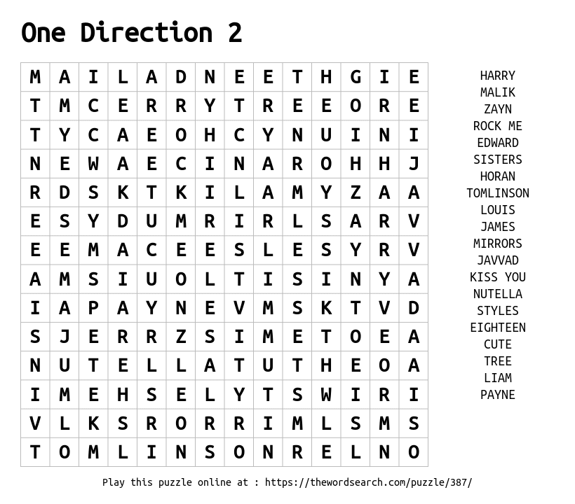 One Direction 2 Printable Word Search