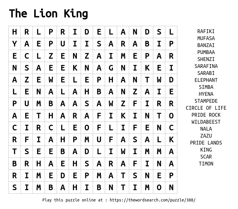 The Lion King Printable Word Search