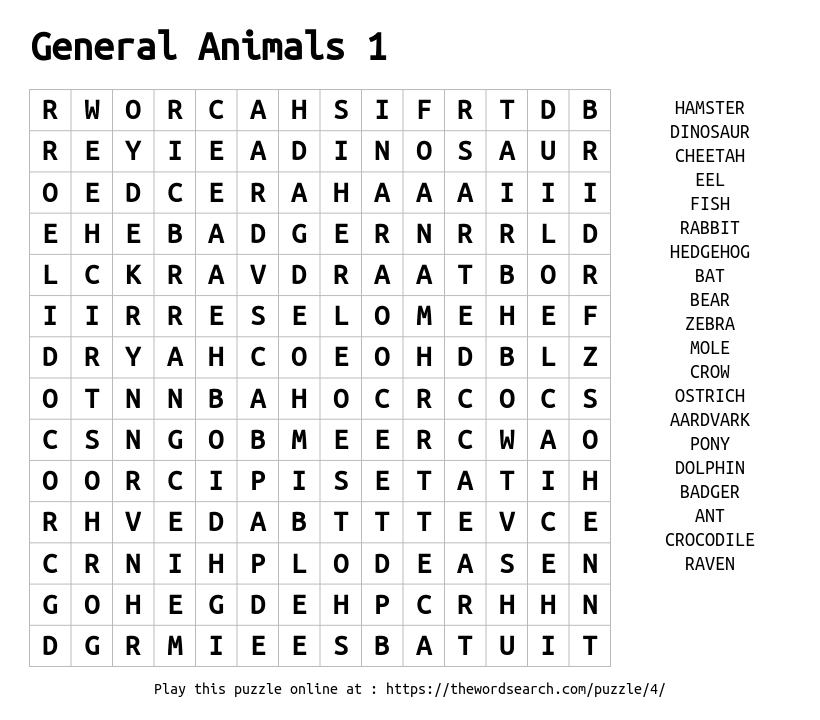 Print this General Animals 1 word search and enjoy a relaxing puzzle with 20 words.