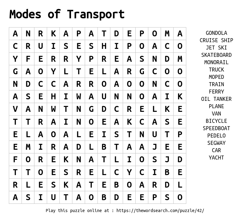 Print this Modes of Transport word search and enjoy a relaxing puzzle with 21 words.