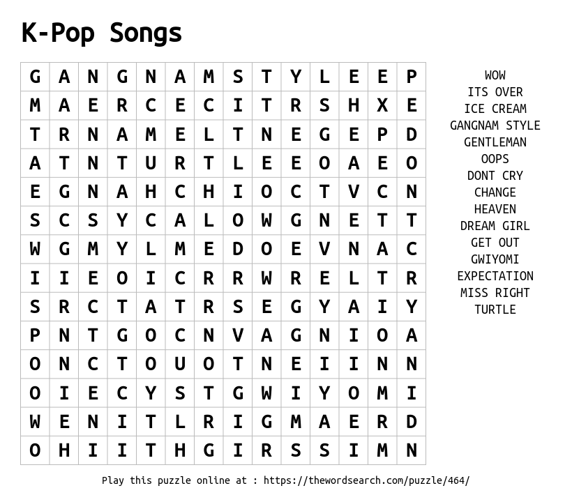 Korean pop is fast becoming popular all around the world. This find-a-word puzzle contains some of the most popular songs hidden within it.