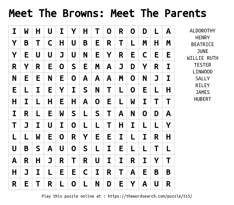 Home / Sitcoms / Meet The Browns: Meet The Parents / Printable Back to puzzle Meet The Browns: Meet The Parents Printable Word Search Find the names of daddy, mamma, their parents and their siblings. The names may be forward, backward, up-and-down and diagonally in straight lines. As you fi...