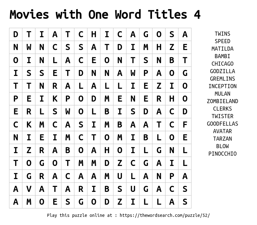 Print this Movies with One Word Titles 4 word search and enjoy a relaxing puzzle with 20 words.