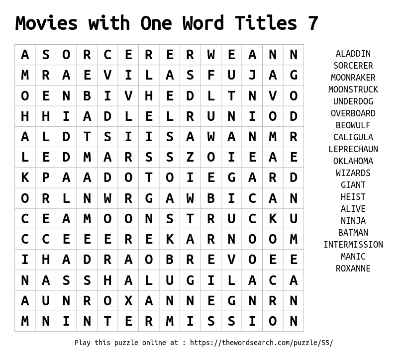 Print this Movies with One Word Titles 7 word search and enjoy a relaxing puzzle with 20 words.