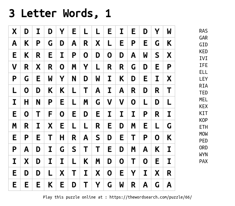 3 Letter Words, 1 Printable Word Search
