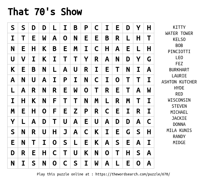 Word search on the long running sitcom that launched the career of Ashton Kutcher, That 70's Show