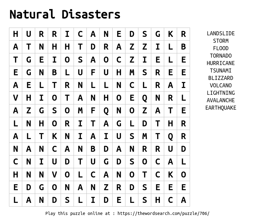 Natural Disasters Printable Word Search