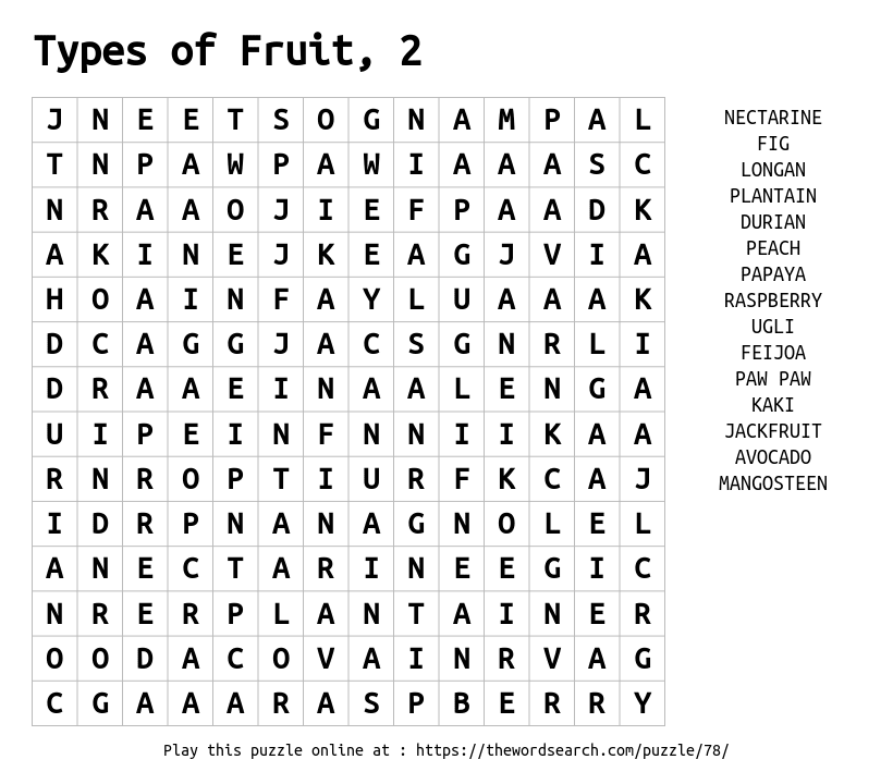 Print this Types of Fruit, 2 word search and enjoy a relaxing puzzle with 19 words.