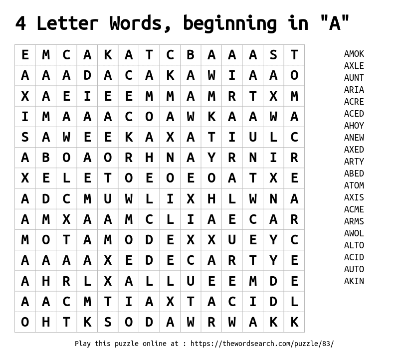 4 Letter Words, beginning in "A" Printable Word Search